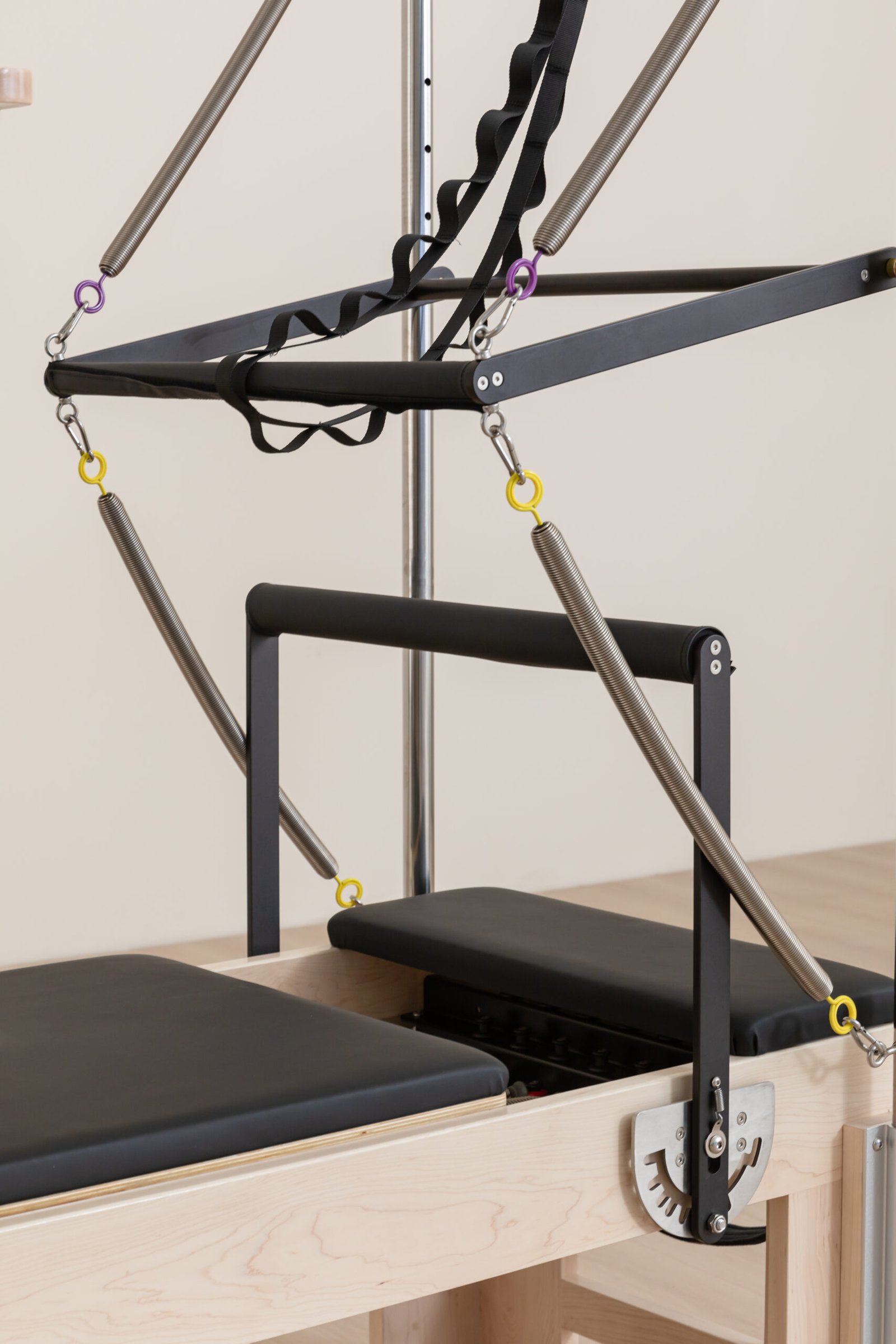 Unlike a traditional Reformer, this system includes a Cadillac frame and Tower unit, enabling additional suspension training, spring-assisted movement, and advanced Pilates exercises.