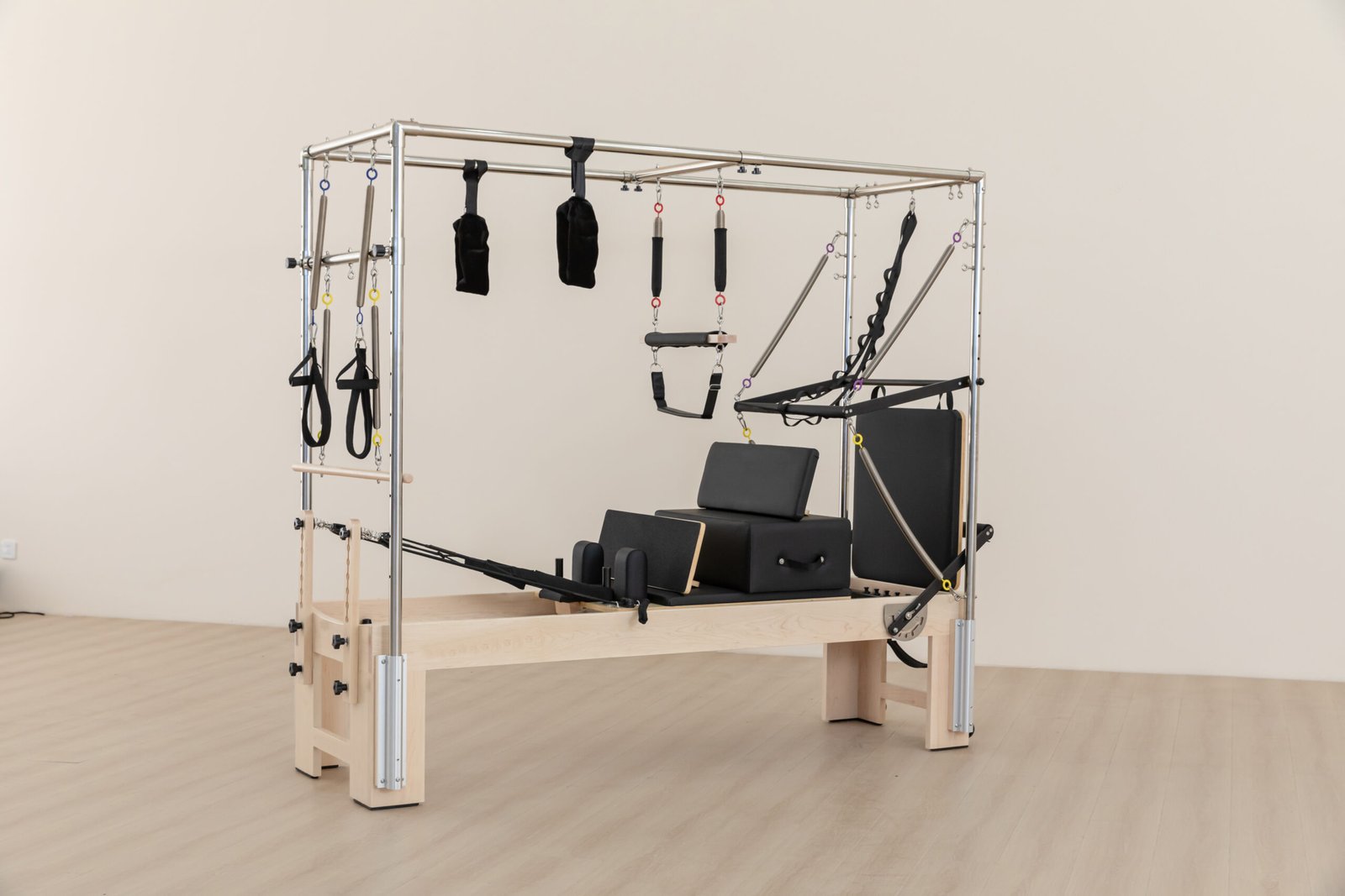 A multi-function Pilates machine integrates a Reformer, Cadillac, and Tower into one single apparatus, allowing users to perform a wide variety of Pilates exercises without needing separate machines.