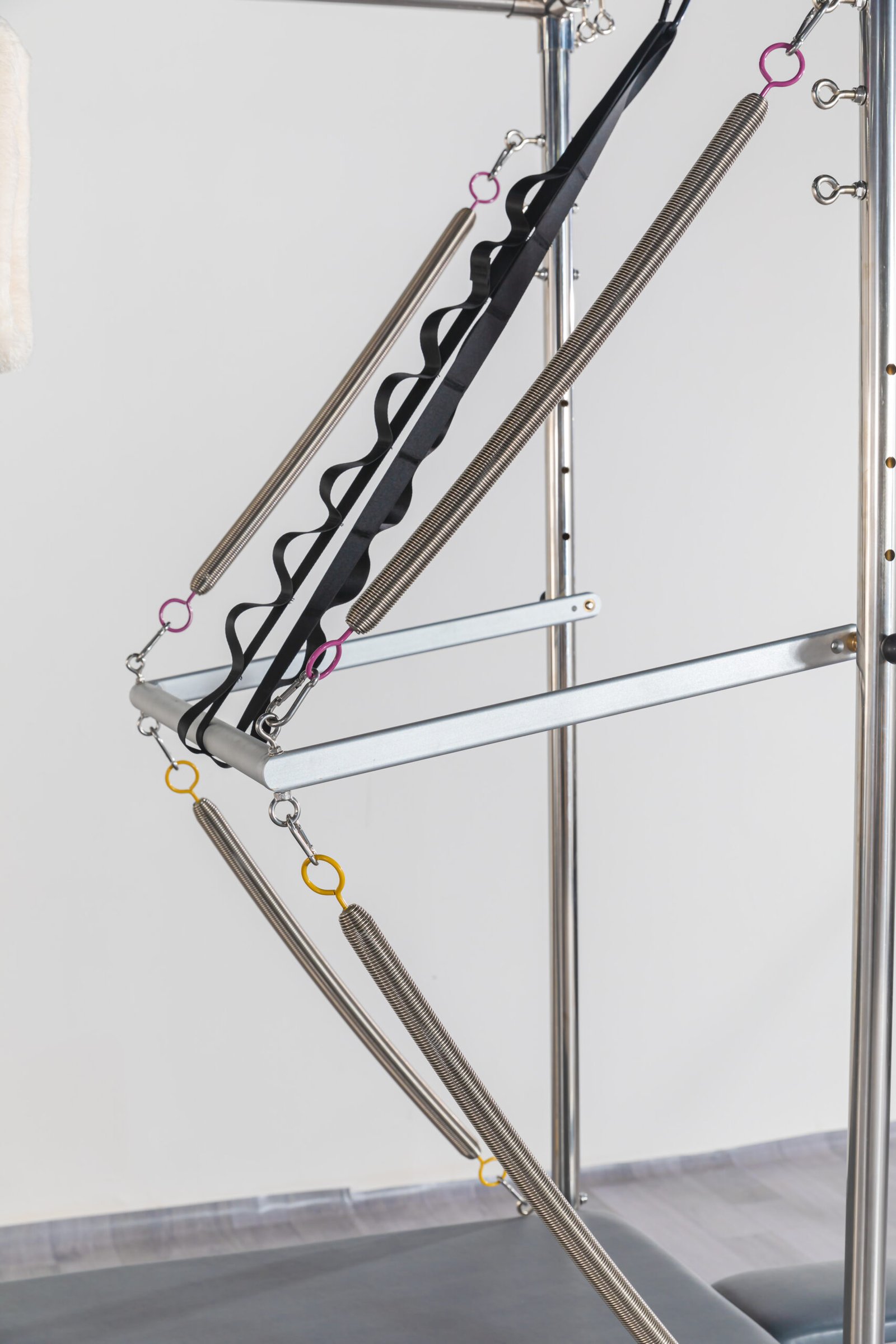 Unlike a standard reformer, the Cadillac includes a trapeze system that enables vertical suspension work, aerial movement, and a broader range of full-body exercises.