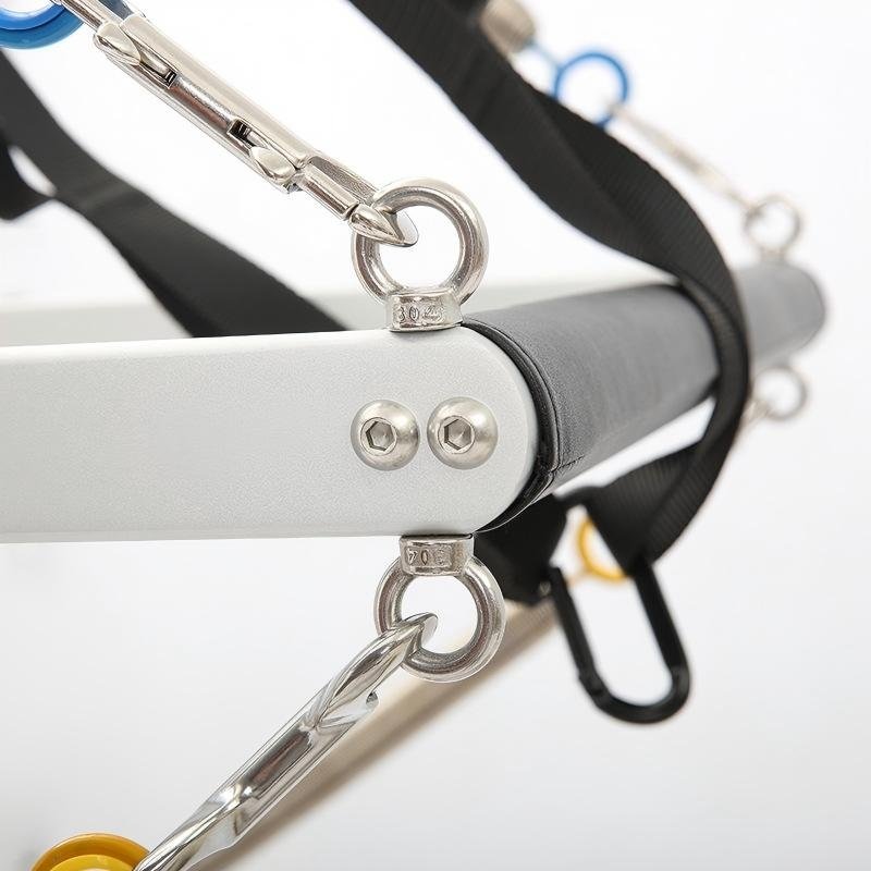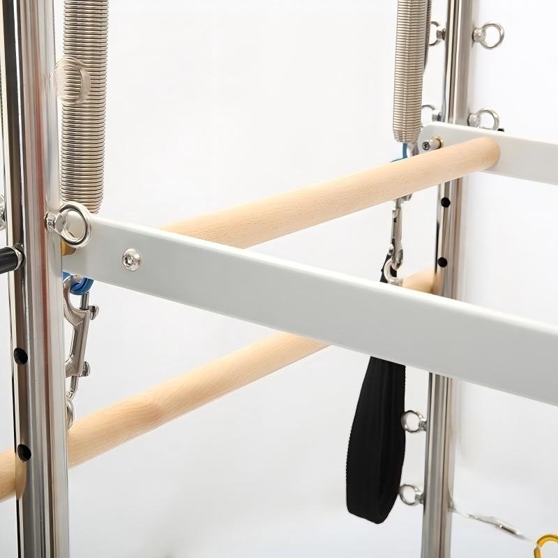 The Vertical Tower: The tower transforms the apparatus. Equipped with a push-through bar, roll-down bar, and multiple attachment points for the included leather-strap loops, it opens up hundreds of additional exercises. These include spine articulation, shoulder strengthening, advanced leg springs series, and full-body stretches. All tower hardware, like the rest of the Pilates Equipment, utilizes 304 stainless steel for corrosion-free longevity, while the three-layer water-washed leather and pure cotton straps ensure comfort and security at every touchpoint.