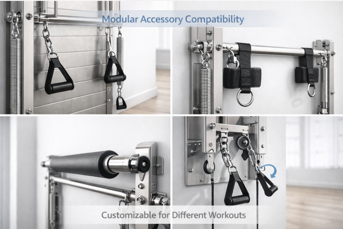 Compatible with various Pilates accessories for personalized workouts and studio flexibility.