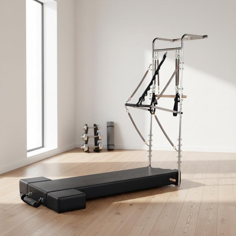 Designed as a wall-supported vertical Pilates unit, this system delivers full training functionality while maintaining a minimal footprint. The upright, wall-aligned structure allows studios and home gyms to optimize space efficiently without permanent wall fixation or floor obstruction.